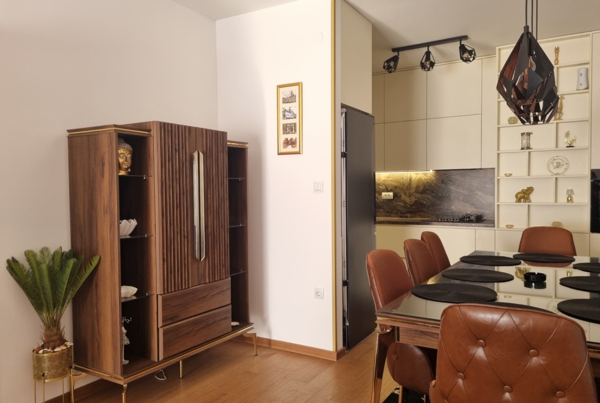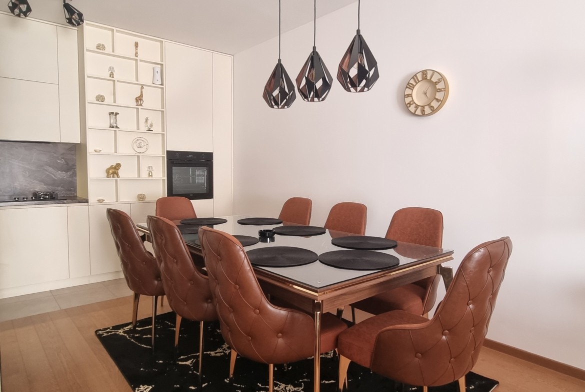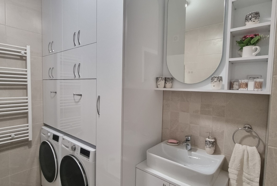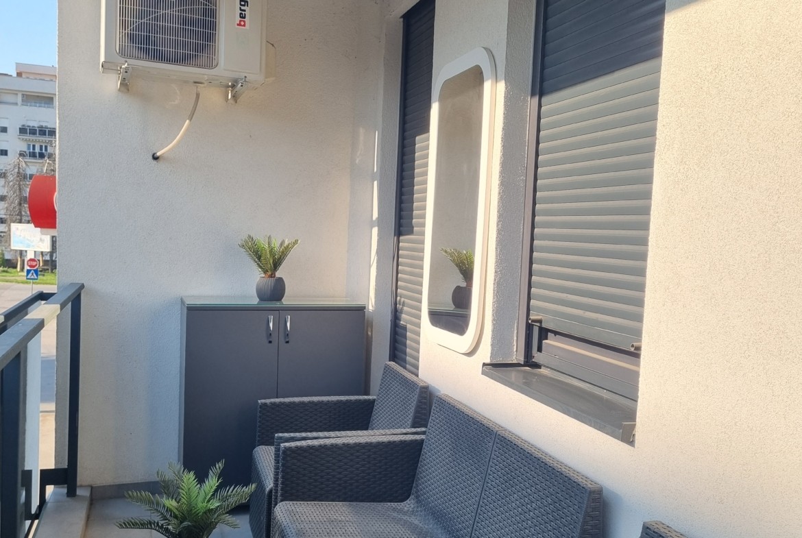 Stan je u potpunosti opremljen luksuznim namještajem i posjeduje vrhunsku kućnu opremu, posuđe, posteljinu i najsavremenije uređaje (klima, veš mašina, sušilica, mašina za suđe, LCD TV, itd).