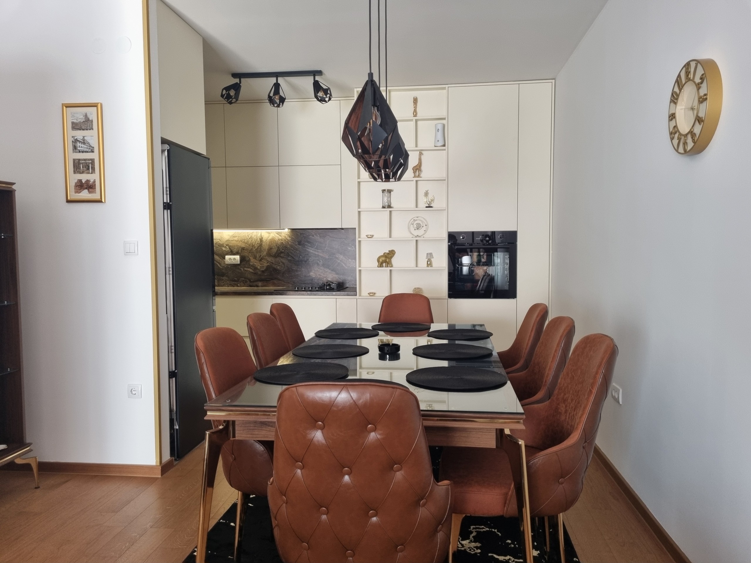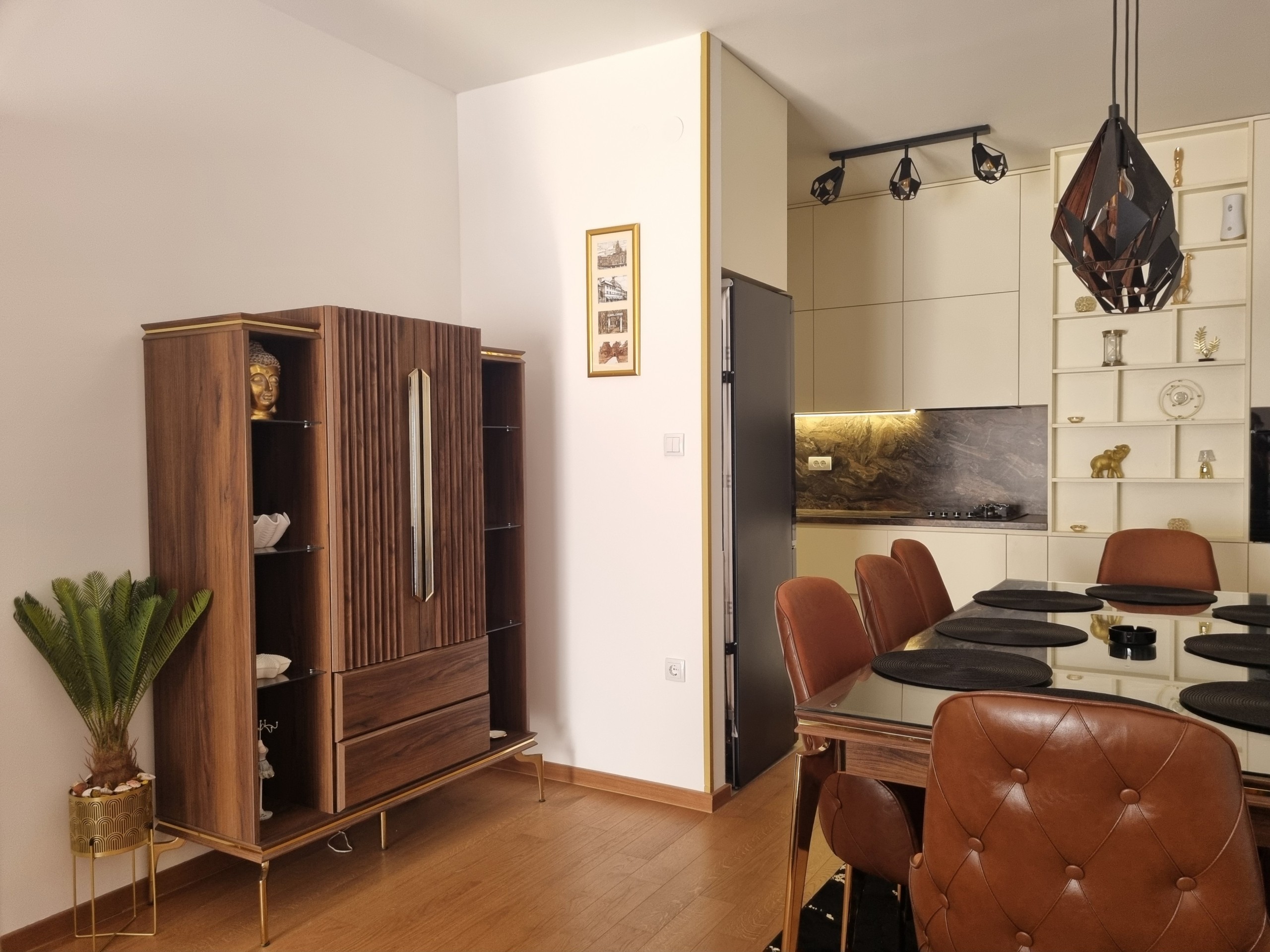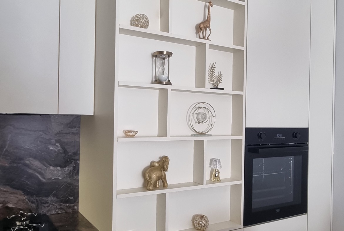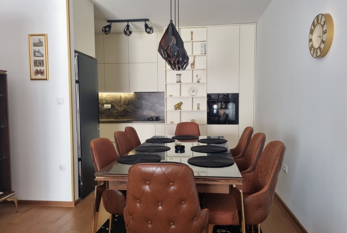 Stan je u potpunosti opremljen luksuznim namještajem i posjeduje vrhunsku kućnu opremu, posuđe, posteljinu i najsavremenije uređaje (klima, veš mašina, sušilica, mašina za suđe, LCD TV, itd).